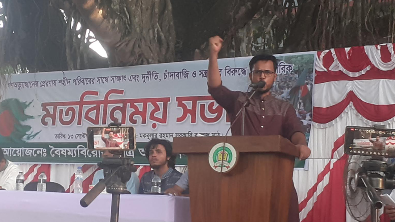 শুক্রবার (১৩ সেপ্টেম্বর) বিকেলে পঞ্চগড় মকবুলার রহমান সরকারি কলেজ মাঠে পঞ্চগড় বৈষম্যবিরোধী ছাত্র আন্দোলন আয়োজিত গণঅভ্যুত্থানের প্রেরণায় শহীদ পরিবারের সঙ্গে সাক্ষাৎ, দুর্নীতি, চাঁদাবাজি ও সন্ত্রাসের বিরুদ্ধে ছাত্র-নাগরিক মতবিনিময় সভায় তিনি এসব কথা বলেন।