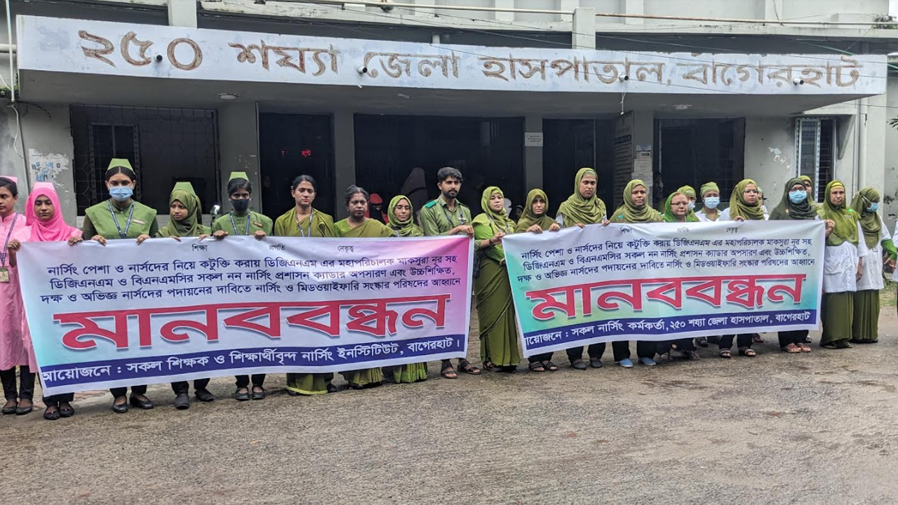 নার্সিং পেশা ও নার্সদের নিয়ে কটূক্তি করায় বাংলাদেশ নার্সিং ও মিডওয়াইফারি অধিদফতরের (ডিজিএনএম) মহাপরিচালক মাসকুরা নূরের পদত্যাগের দাবিতে বাগেরহাট জেলার সব নার্সিং কর্মকর্তা ও শিক্ষার্থীরা মানববন্ধন করেছেন।
