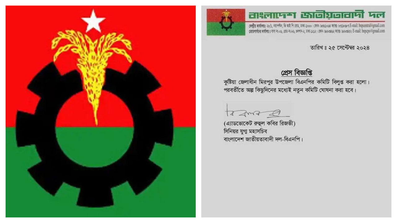 বিজ্ঞপ্তিতে উল্লেখ করা হয়, কুষ্টিয়া জেলাধীন মিরপুর উপজেলা বিএনপির কমিটি বিলুপ্ত করা হলো। অল্প কিছুদিনের মধ্যেই নতুন কমিটি ঘোষণা করা হবে।