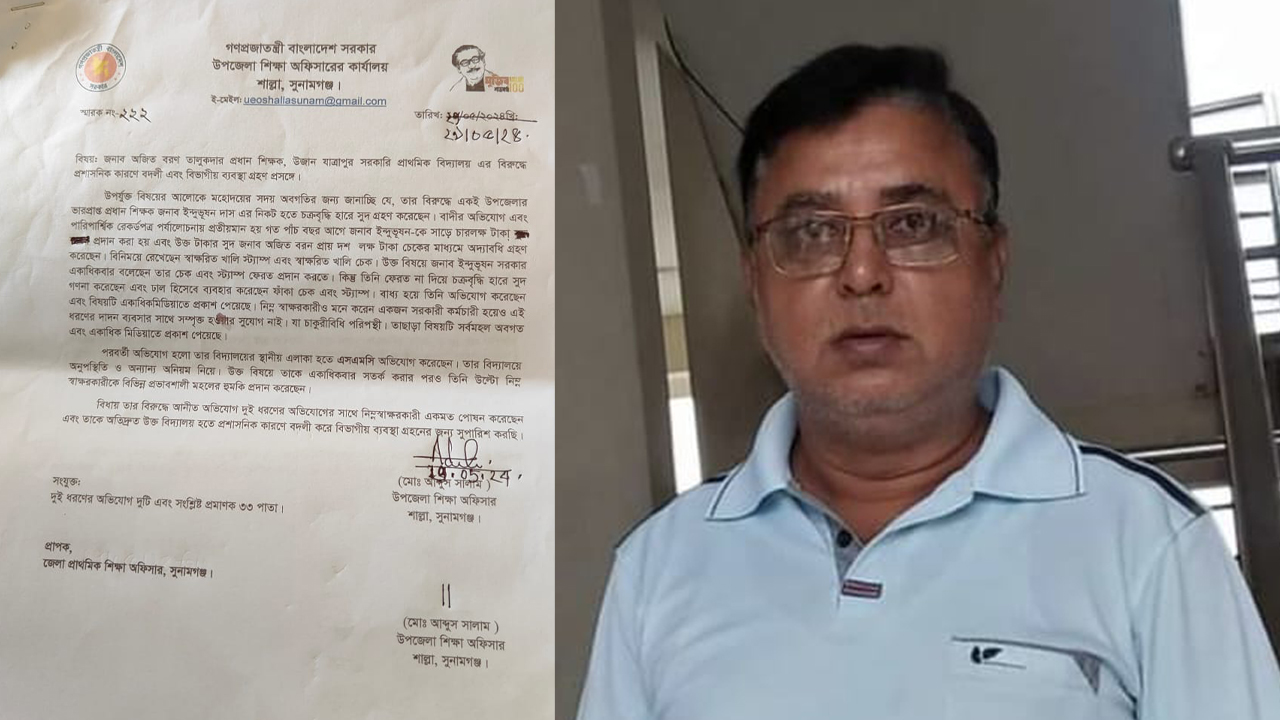 চিঠি সূত্রে আরও জানা যায়, শিক্ষক অজিত বরণ তালুকদার শাল্লা উপজেলার আছানপুর সরকারি প্রাথমিক বিদ্যালয়ের ভারপ্রাপ্ত প্রধান শিক্ষক ইন্দুভূষণ দাসকে পাঁচ বছর আগে কড়া সুদের বিনিময়ে ৪ লাখ ৫০ হাজার টাকা প্রদান করেন। সেই টাকার বিনিময়ে চেকের মাধ্যমে সুদ হিসেবে ১০ লাখ টাকা গ্রহণ করেন তিনি। যা সরকারি চাকরির (আচরণ) বিধিমালা ১৯৭৯-এর সম্পূর্ণ পরিপন্থি। এ ছাড়াও স্কুলে অনুপস্থিত হয়ে বিভিন্ন অনিয়মের সঙ্গে জড়িত থাকার বিষয়টি উল্লেখ করে ওই চিঠিতে আরও বলা হয়েছে, তার বিভিন্ন অনিয়ম ও দুর্নীতির বিষয়ে তার সংশ্লিষ্ট দপ্তর তাকে (অজিত মাস্টার) একাধিকবার সতর্ক করে দেওয়ার পরেও উলটো প্রভাবশালী মহলের মাধ্যমে শিক্ষা কর্মকর্তাকে হুমকি প্রদান করেন তিনি।