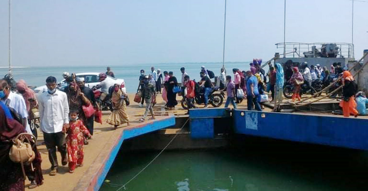আরও দেখা যায়, নদী পার হওয়ার জন্য শত শত মানুষ ফেরিঘাটগুলোয় ভিড় করছে। একটি ফেরি ঘাটে ভেড়ার সঙ্গে সঙ্গে মানুষ গাদাগাদি করে ফেরিতে উঠছে। এ সময় অনেককে ফেরি ছাড়ার মুহূর্তেও ঝুঁকি নিয়ে ফেরিতে উঠতে দেখা গেছে।