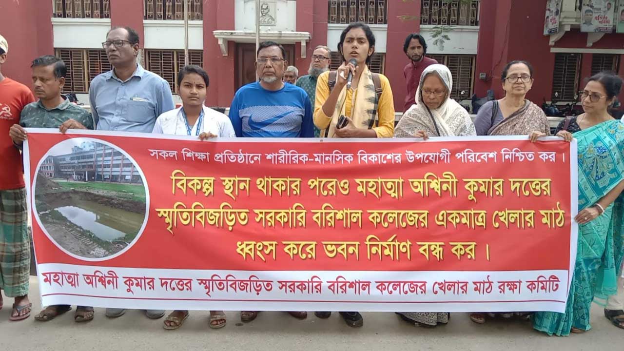 মহাত্মা অশ্বিনী কুমার দত্তের স্মৃতিবিজড়িত সরকারি বরিশাল কলেজের একমাত্র মাঠ নষ্ট করে ভবন নির্মাণ বন্ধের দাবিতে বরিশালে মানববন্ধন কর্মসূচি পালন করেছে মাঠ রক্ষা কমিটি।
