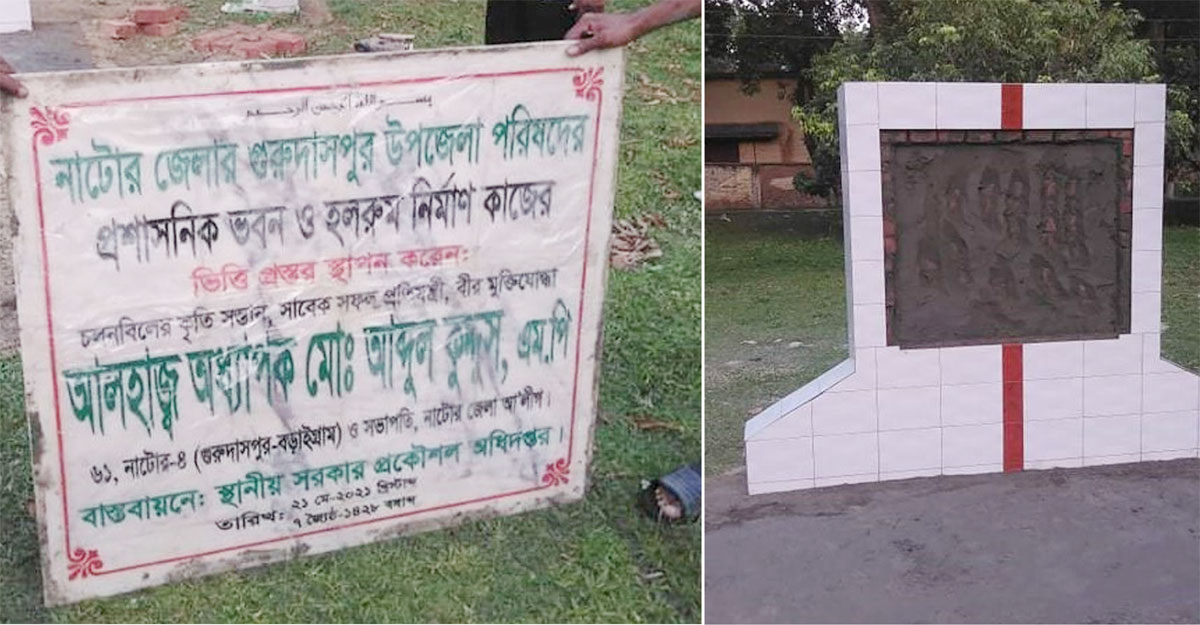 নাটোরের গুরুদাসপুর উপজেলা পরিষদের প্রশাসনিক ভবন ও হলরুম নির্মাণকাজের উদ্বোধনের ভিত্তিপ্রস্তরের নামফলক নির্মাণ করা হয়েছিল। কিন্তু নামফলকে নিজের নাম না থাকায় তা তুলে ফেললেন উপজেলা চেয়ারম্যান মো. আনোয়ার হোসেন।