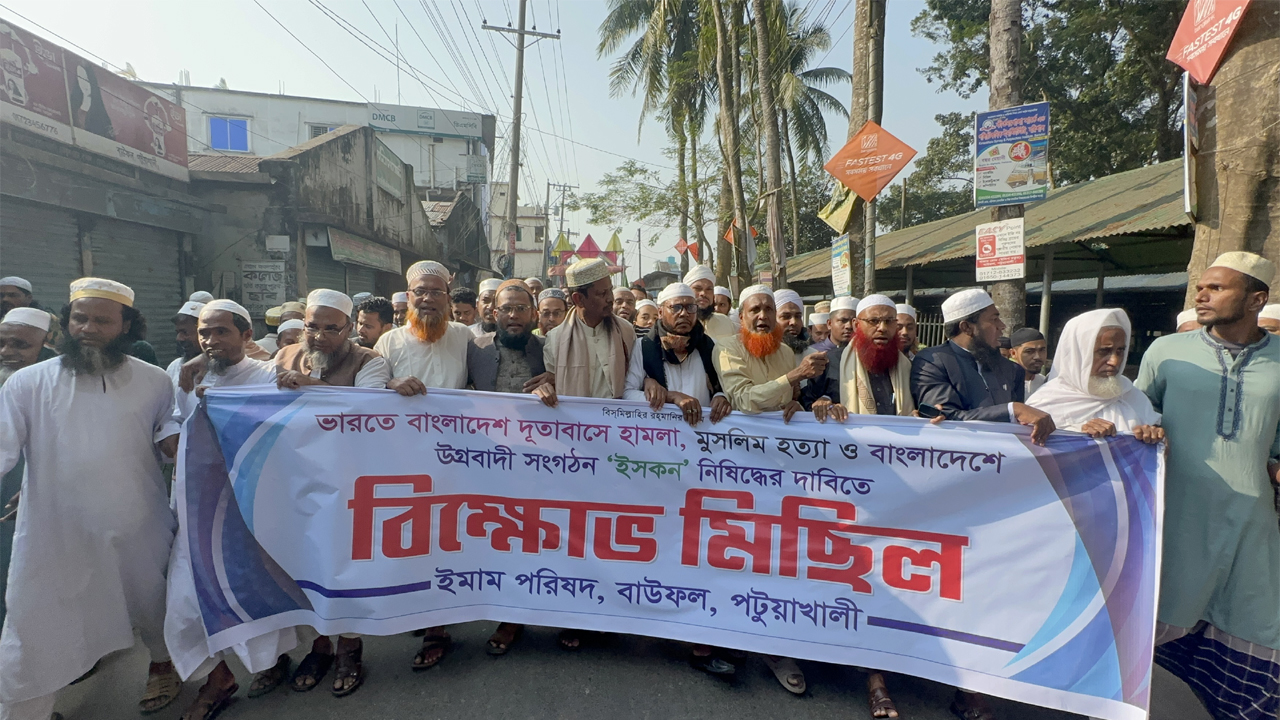 ভারতের আগরতলায় বাংলাদেশ হাইকমিশনে হামলার প্রতিবাদে ও ইসকন নিষিদ্ধের দাবিতে পটুয়াখালীর বাউফলে বিক্ষোভ মিছিল ও সমাবেশ করেছে উপজেলা ইমাম পরিষদ।