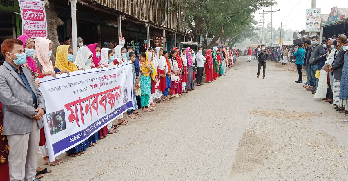পাবনায় গৃহবধূর খুনির গ্রেফতার দাবিতে মানববন্ধন