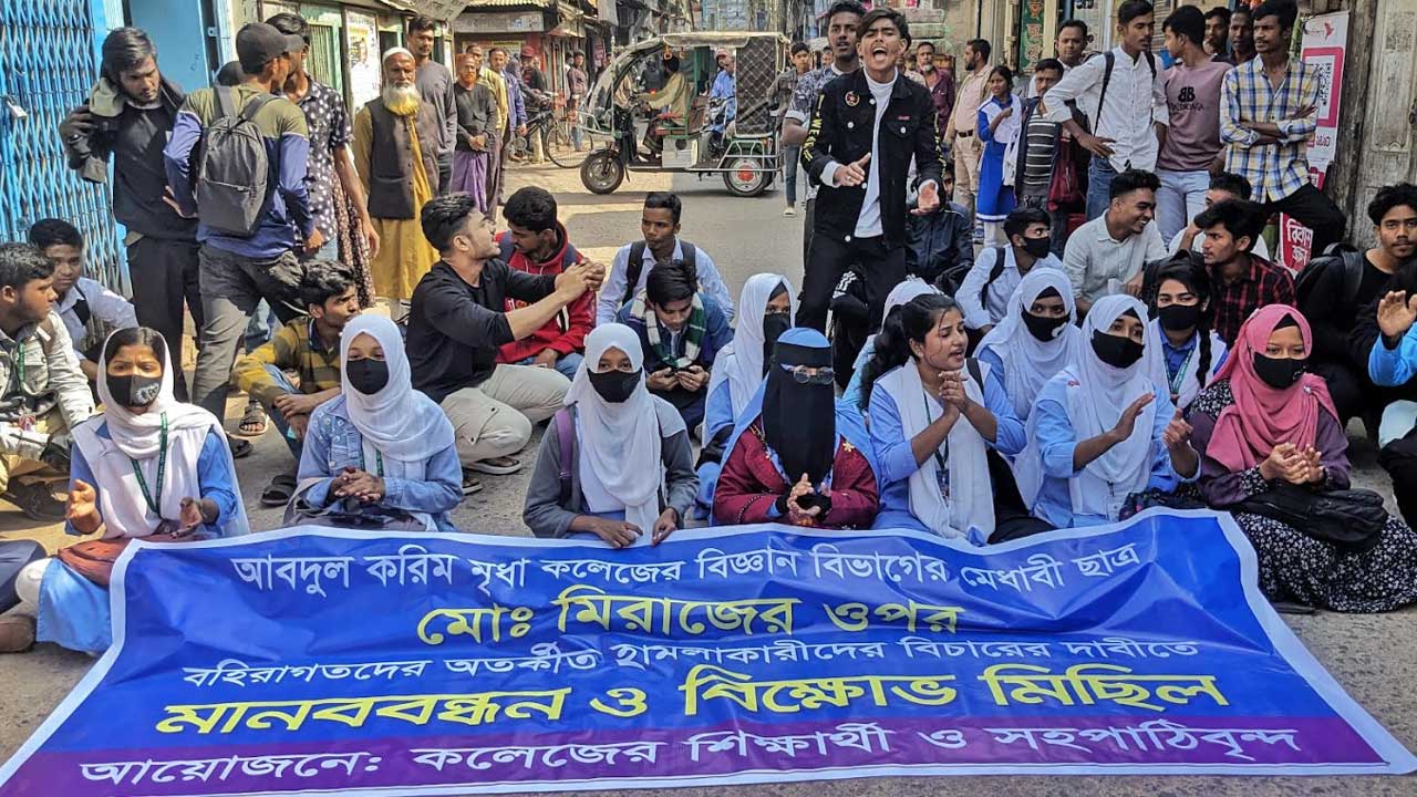 পটুয়াখালীর আব্দুল করিম মৃধা (একেএম) কলেজের ছাত্র মোহাম্মদ মিরাজের ওপর বহিরাগতদের হামলার ঘটনার প্রতিবাদে সড়ক অবরোধ ও বিক্ষোভ করেছেন শিক্ষার্থীরা।