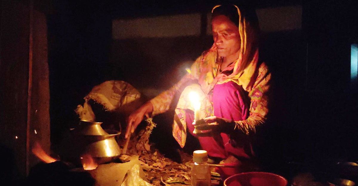 ঘুটঘুটে অন্ধকারে এক হাতে মোমবাতি জ্বালিয়ে আরেক হাত দিয়ে রান্না করছেন সখিনা বেওয়া (৫০)। ঘরের বাইরে বিকল্প আলোতে রান্না করতে পারলেও ঘর রয়েছে অন্ধকারে। একদিকে নিরাপত্তার অভাব অন্যদিকে রান্না শেষ করে সেই মোমের আলোতে ঘরে যেতে হবে তাকে।