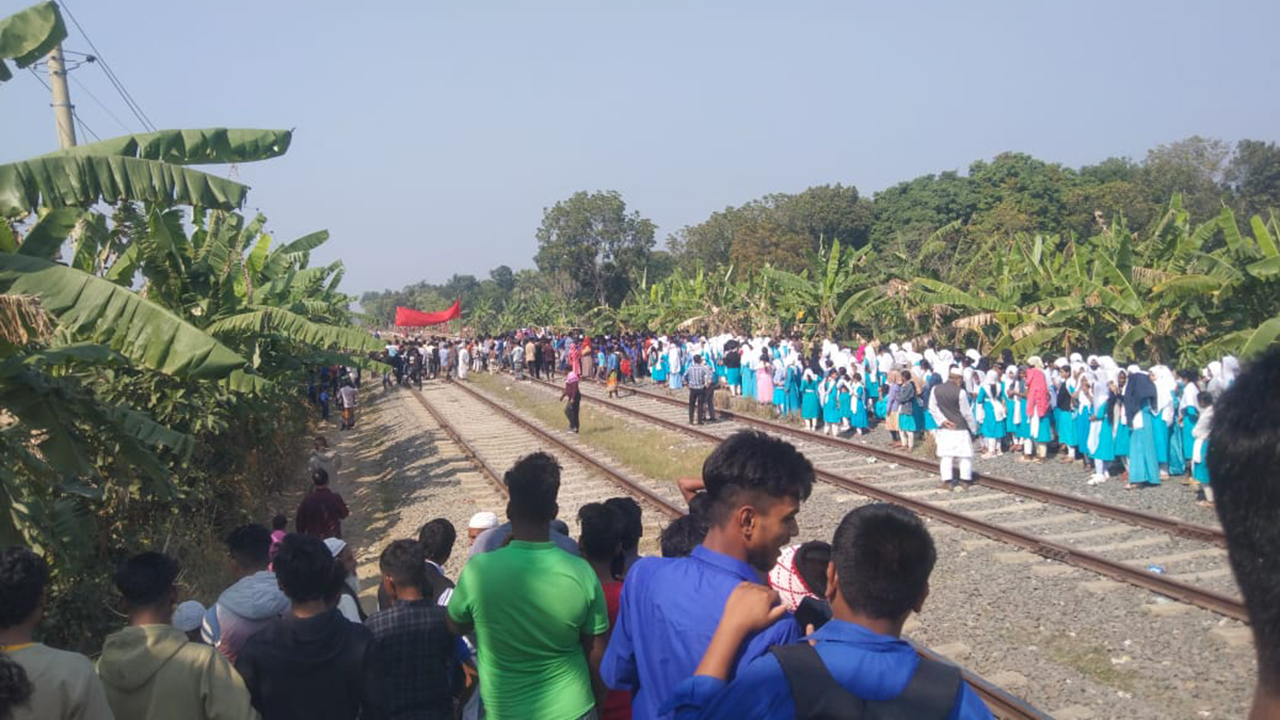 যাত্রাবিরতি বাতিলের ঘোষণায় ট্রেন আটকে রেলপথ অবরোধ