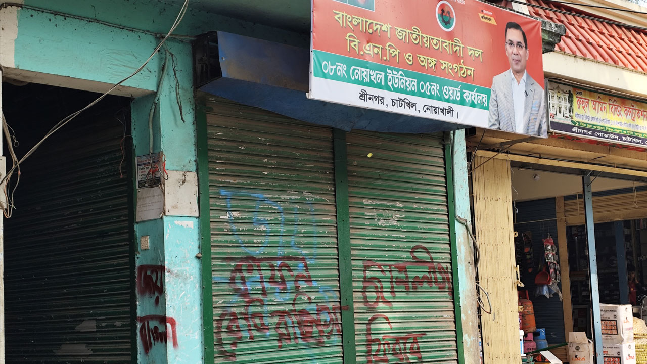 নোয়াখালীর চাটখিলে বিএনপির দলীয় কার্যালয়ের সাটারে ‘কাফন রেডি রাখিস, ছাত্রলীগ ফিরবে’ লিখেছে দুর্বৃত্তরা। উপজেলার নোয়াখলা ইউনিয়নের শ্রীনগর ৫ নম্বর ওয়ার্ড বিএনপি ও অঙ্গ সংগঠনের অফিসে রাতের আঁধারে এই লিখাটি লিখে যায় দুষ্কৃতকারীরা।
