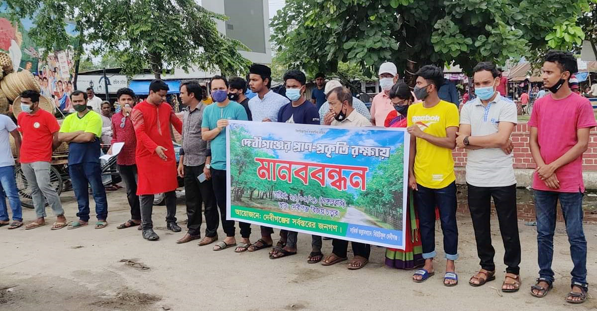 প্রাণ প্রকৃতি রক্ষায় মঙ্গলবার (২৫ মে) দুপুরে অনলাইন ভিত্তিক সামাজিক সংগঠন বিউটিফুল দেবীগঞ্জের ব্যানারে উপজেলার বিজয় চত্বর মোড়ে এক মানববন্ধন অনুষ্ঠিত হয়। মানববন্ধনে একাত্মতা প্রকাশ করে একত্রিত হয় ক্লিন দেবীগঞ্জ, প্রাণের দেবীগঞ্জ, সবুজ আন্দোলন, নদী সাংস্কৃতিক সংগঠনসহ বিভিন্ন সামাজিক সংগঠন।