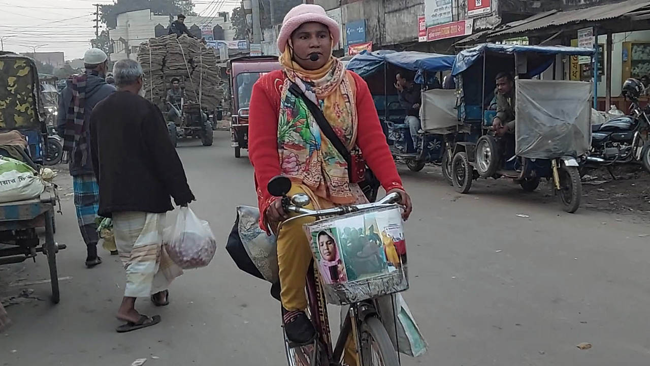 এভাবেই একটি সাউন্ডবক্স বাজিয়ে হাটে-বাজারে, পথে-প্রান্তরে সাইকেলে করে চা পাতা বিক্রি করেন ফরিদা পারভিন সাথী (৩২)।