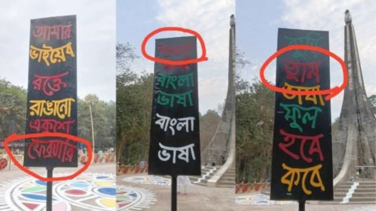 শহীদ মিনারে সাঁটানো এসব প্ল্যাকার্ডে ‘বাংলাদেশের’ শব্দের জায়গায় বাংলাশের, 'কুঁড়ি’কে কুঁডি, 'ফেব্রুয়ারি’কে ফেব্রয়ারি, 'তুমি’কে তুাম লেখার মতো ভুল দেখা গেছে। এ ছাড়া, 'একুশ মানে মাথা নত না করা।' জায়গায় লেখা হয়েছে ‘একুশ মানি মাথা নথ না করা’।