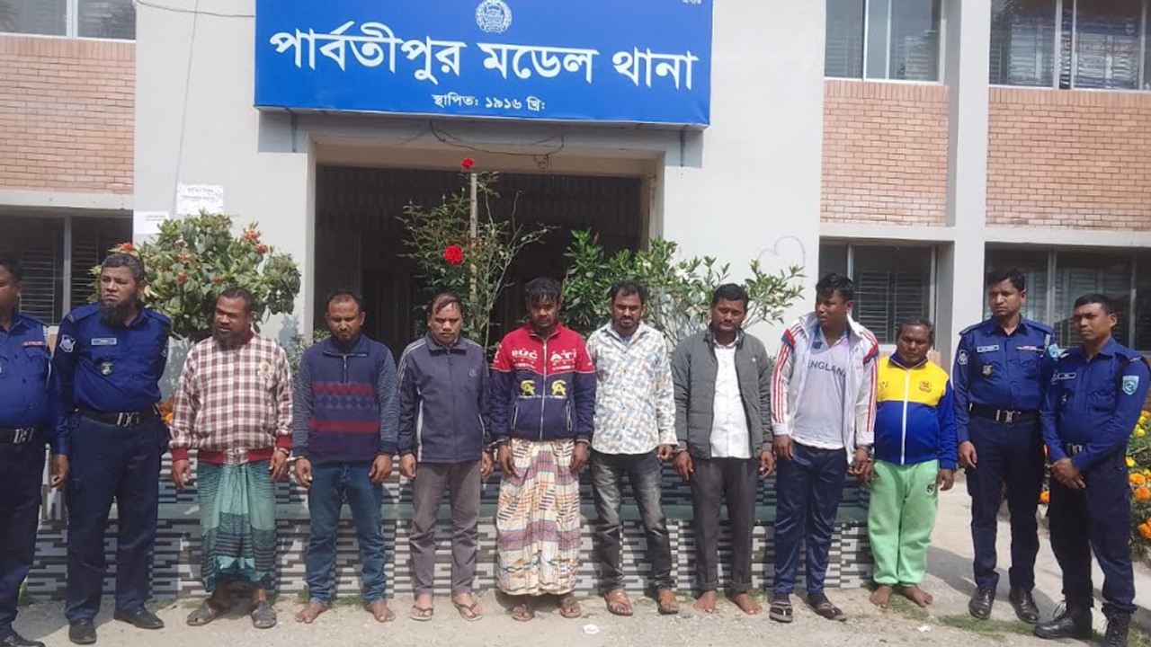 পার্বতীপুর উপজেলার হামিদপুর ইউনিয়নের 8 নম্বর ওয়ার্ড আওয়ামী লীগের সাংগঠনিক সম্পাদক আবু দাউদ রুহুল আমিন পলাশ (৪০)। পার্বতীপুর উপজেলার হরিরামপুর ইউনিয়নের ৭ নম্বর ওয়ার্ড আওয়ামী লীগের সাধারণ সম্পাদক জিয়াদুল ইসলাম (৪০)। পার্বতীপুর উপজেলার হরিরামপুর ইউনিয়নের ৮ নম্বর ওয়ার্ড আওয়ামী লীগের কর্মী শফিকুল ইসলাম (৪৮), বিলাইচন্ডি ইউনিয়নের 8 নম্বর ওয়ার্ড আওয়ামী লীগের কর্মী দুলাল প্রামানিক (৪০)। পার্বতীপুর পৌর আওয়ামী লীগের দপ্তর সম্পাদক মমিনুল ইসলাম (৫০)। পার্বতীপুর উপজেলা যুবলীগের সাংগঠনিক সম্পাদক রিয়াসাদ সারোয়ার জয়কে (৩০) গ্রেপ্তার করেছে পুলিশ।