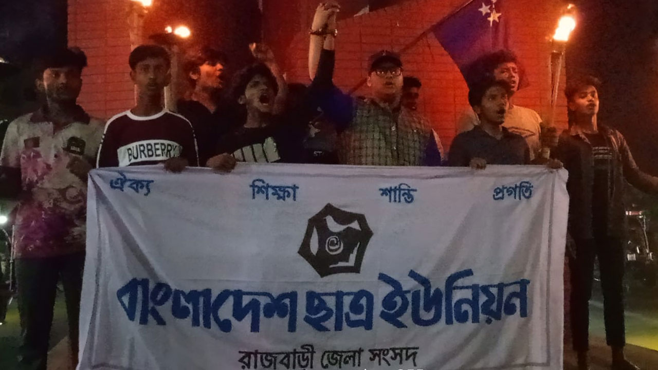 দুর্নীতি, ধর্ষণ, ডাকাতি ও চাঁদাবাজি বন্ধে রাজবাড়ীতে মশাল মিছিল