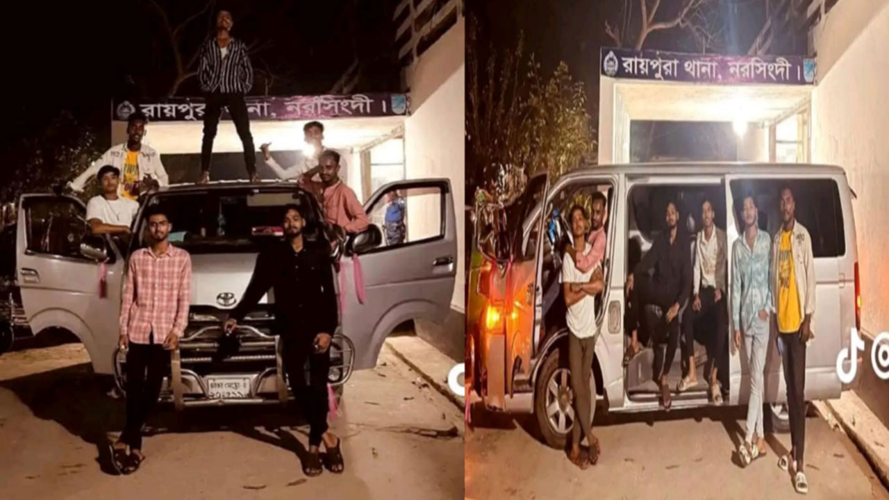নরসিংদীর রায়পুরা থানার মূল ফটকের সামনে ফিল্মি কায়দায় মাফিয়া গ্যাং স্টাইলের কিছু যুবকের বেপরোয়া আচরণের ছবি সামাজিক যোগাযোগ মাধ্যমে ভাইরাল হয়েছে। ছবিগুলোতে দেখা যায়, কয়েকজন যুবক রাতে একটি মাইক্রোবাসের সামনে ও ছাদে উঠে বিভিন্ন অঙ্গভঙ্গি করে ছবি তুলছে। তাদের মধ্যে কেউ কেউ মাইক্রোবাসের দরজা খুলে, কেউবা ছাদে দাঁড়িয়ে, আবার কেউ গুণ্ডা-বখাটে ধাচের ভঙ্গিতে পোজ দিচ্ছে।