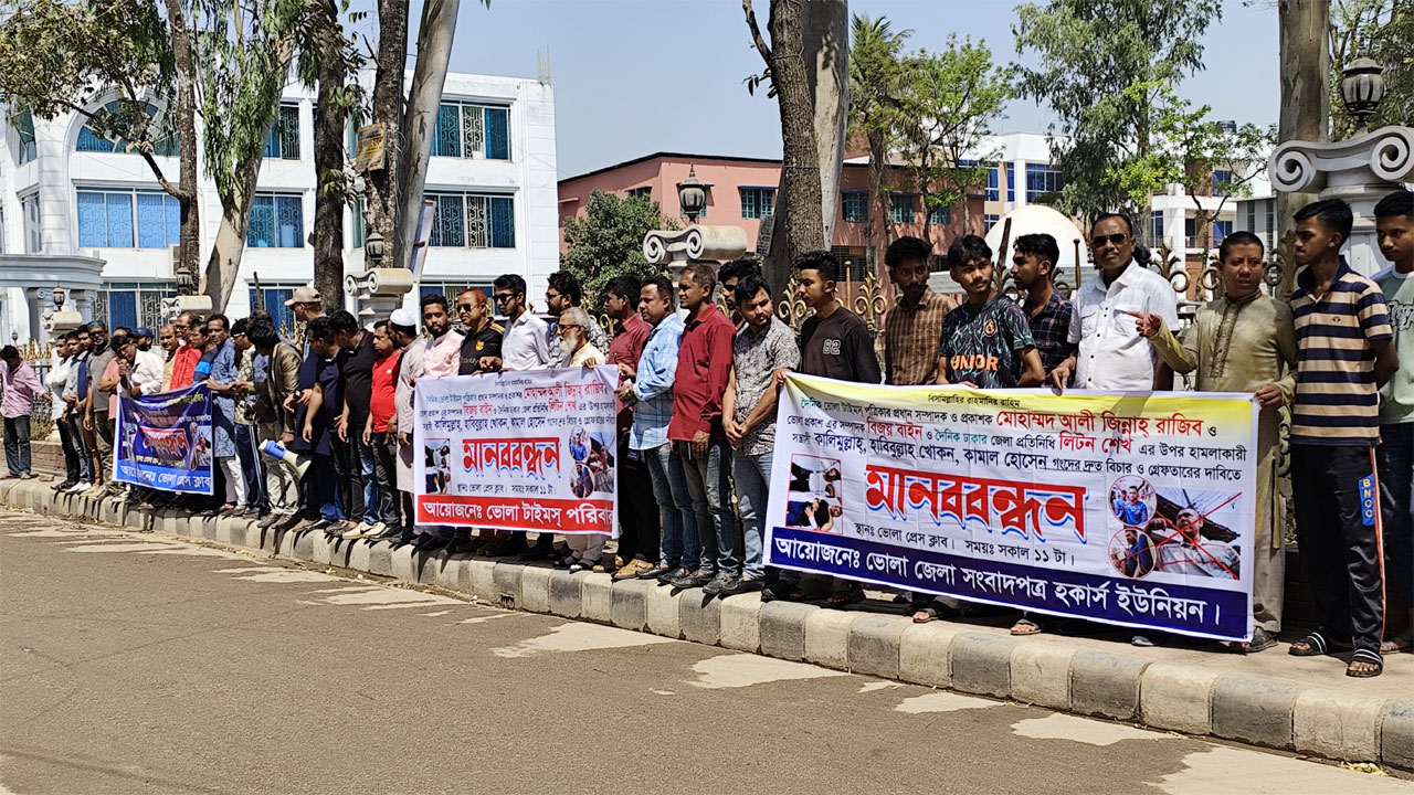 গতকাল ভোলা প্রেসক্লাবের সামনে ঘণ্টাব্যাপী এ মানববন্ধন কর্মসূচি পালিত হয়। এর আগে গত মঙ্গলবার সকালে ভোলা জেলা শহরের শীশমহল গলি সংলগ্ন খালপাড় এলাকায় এ হামলার ঘটনা ঘটে।