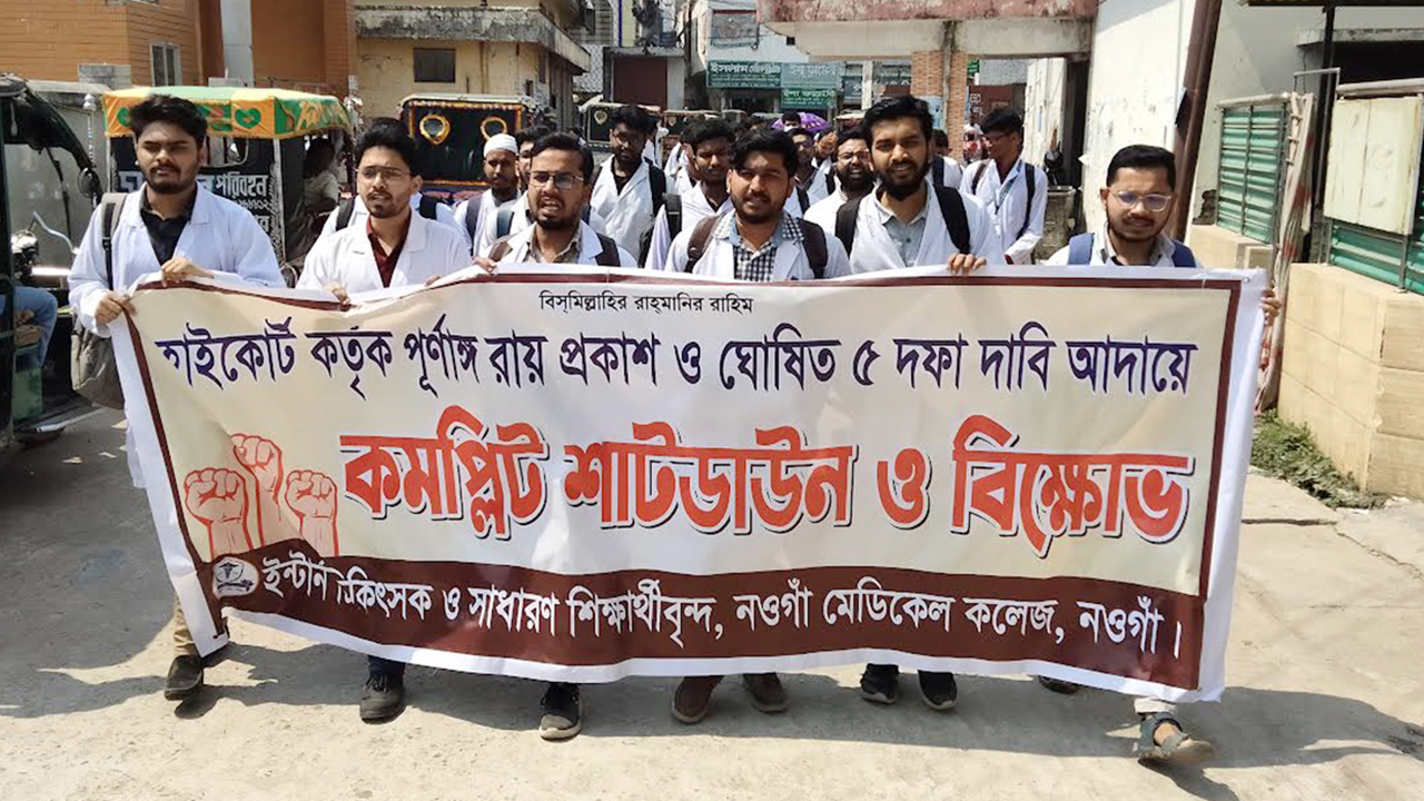 হাইকোর্ট কর্তৃক পূর্ণাঙ্গ রায় প্রকাশ এবং পাঁচ দফা দাবিতে কমপ্লিট শাটডাউন ঘোষণা করে বিক্ষোভ এবং সংবাদ সম্মেলন করেছেন ২৫০ শয্যা নওগাঁ জেনারেল হাসপাতালের ইন্টার্ন চিকিৎসকরা। চিকিৎসকদের দাবির প্রতি সংহতি জানিয়ে ক্লাস এবং পরীক্ষা বর্জন করে এতে অংশ নিয়েছেন নওগাঁ মেডিকেল কলেজের শিক্ষার্থীরা। শিক্ষার্থীরা দাবি আদায়ের লক্ষ্যে ১২ মার্চ পর্যন্ত সকল ক্লাস-পরীক্ষা বর্জনের ঘোষণা দিয়েছেন।