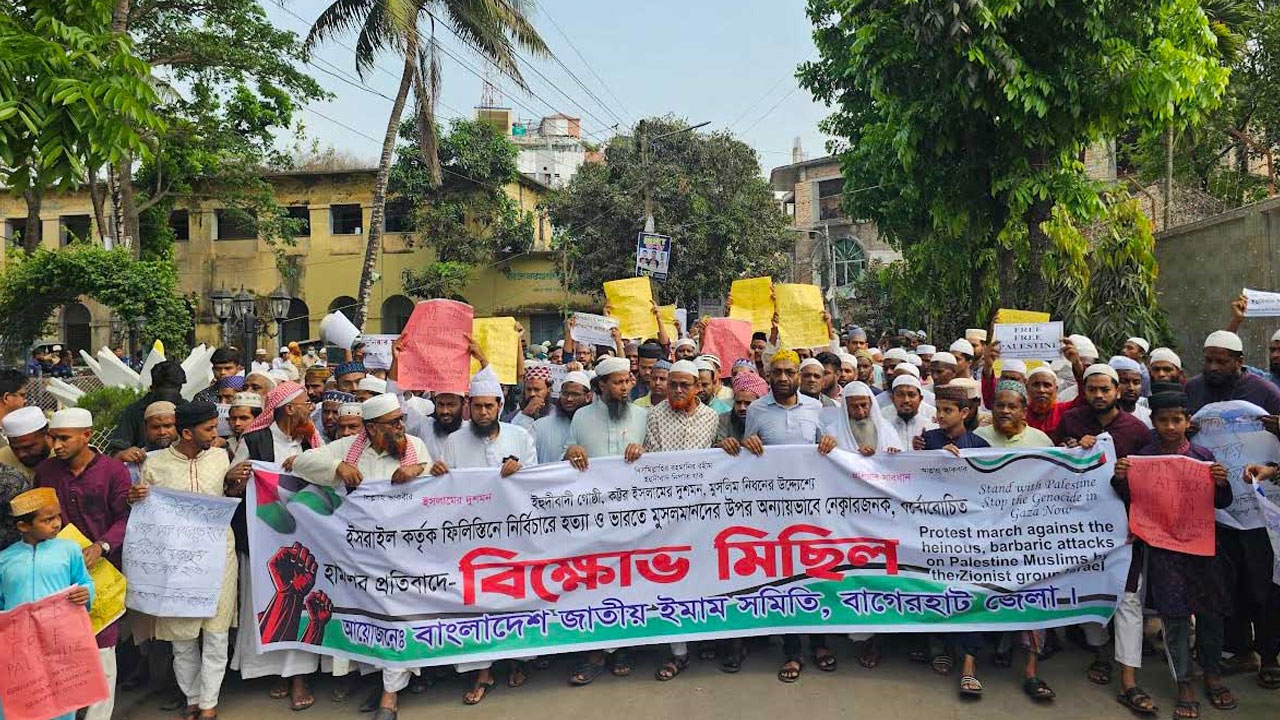 ফিলিস্তিনে ইসরায়েলের বর্বরতা ও ভারতে মুসলিমদের ওপর আক্রমণের প্রতিবাদে বাগেরহাটে বিক্ষোভ মিছিল ও সভাবেশ অনুষ্ঠিত হয়েছে। বাংলাদেশ জাতীয় ইমাম সমিতির বাগেরহাট জেলা শাখার উদ্যোগে শুক্রবার দুপুরে শহরের কেন্দ্রীয় কোর্ট মসজিদের সামনে থেকে মিছিলটি শুরু হয়ে শহরের বিভিন্ন সড়ক প্রদক্ষিণ করে। পরে প্রেসক্লাবের সামনে সমাবেশ অনুষ্ঠিত হয়।