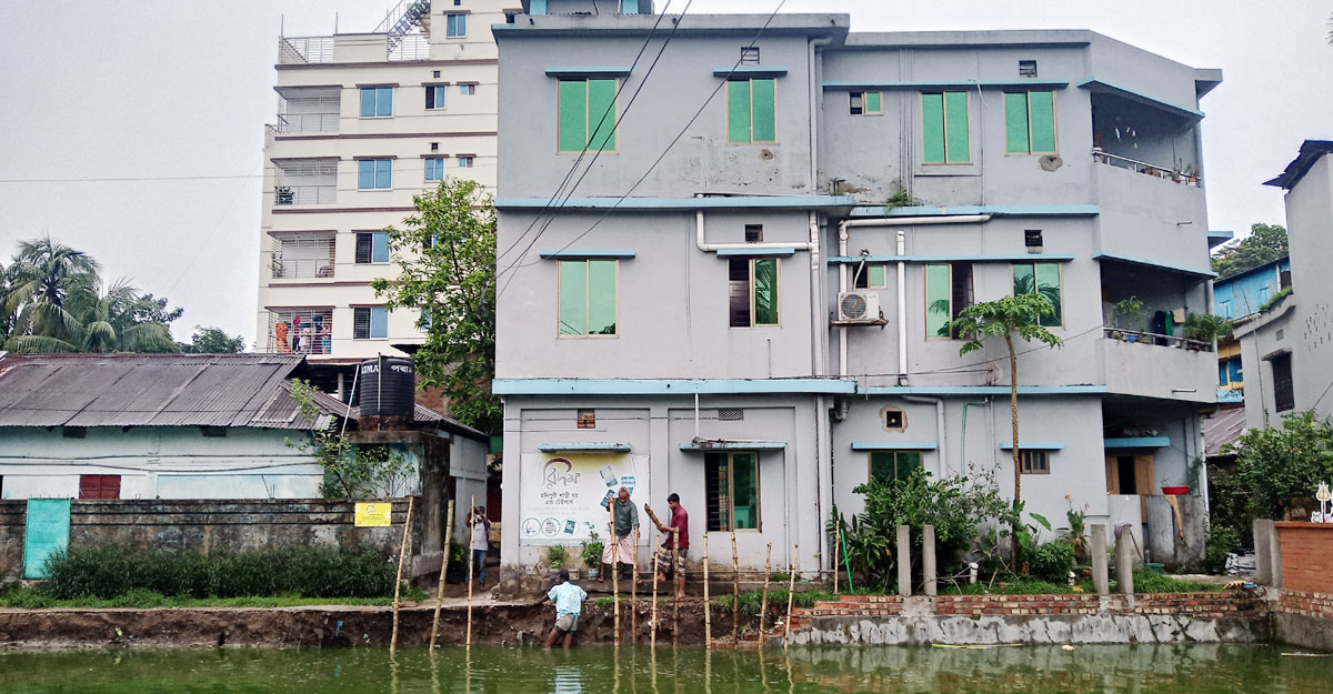 ভবনটির মালিক রঞ্জন সিংহ রাজিব জানান, বিকেল ৩টার দিকে পুকুর পাড়টি ধসে যায়। তারপর সেখানের বাসিন্দাদের নিরাপদে সরিয়ে নেওয়া হয়। পুকুর পাড়টি ধসে যাওয়ার কারণে ভবনটি ঝুঁকিপূর্ণ হয়ে গেছে।