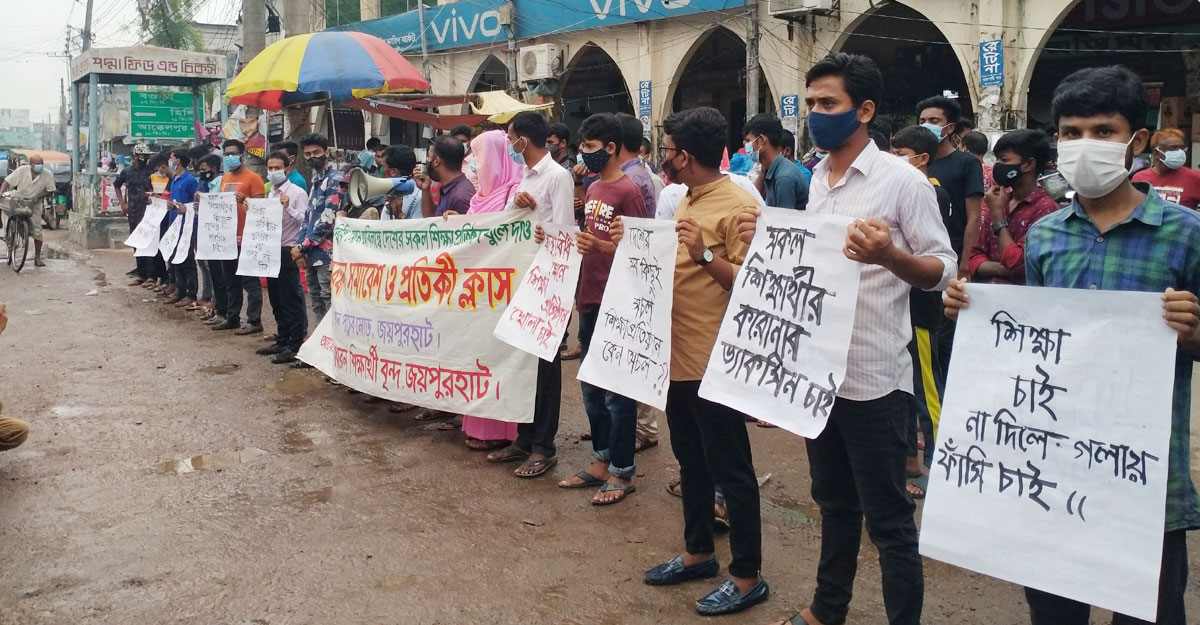 স্বাস্থ্যবিধি মেনে অবিলম্বে দেশের সকল শিক্ষাপ্রতিষ্ঠান খুলে দেওয়ার দাবিতে জয়পুরহাটে মানববন্ধন, সমাবেশ ও প্রতীকী ক্লাস করেছেন শিক্ষার্থীরা। মঙ্গলবার (১ জুন) বেলা সাড়ে ১১টার দিকে শহরের জিরো পয়েন্ট পাঁচুর মোড় মসজিদ মার্কেটের সামনে এসব কর্মসূচির আয়োজন করা হয়।