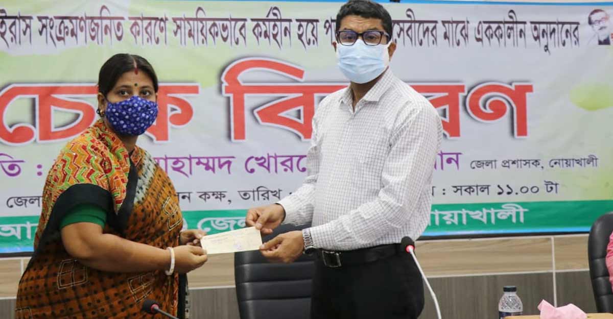 মহামারি করোনাভাইরাসের কারণে কর্মহীন হয়ে পড়া নোয়াখালীর শিল্পী ও সাহিত্যিকদের মাঝে প্রধানমন্ত্রী শেখ হাসিনার পক্ষ থেকে দেওয়া অনুদানের চেক বিতরণ করা হয়েছে।