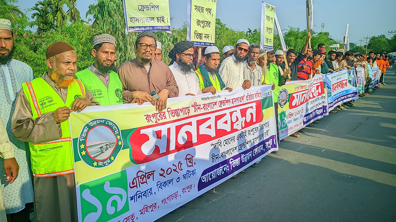 এ ধারাবাহিকতায় শনিবার (১৯ এপ্রিল) বিকেলে রংপুরের তিস্তা নদীর তীরবর্তী গঙ্গাচড়ায় চীনের অর্থায়নে এক হাজার শয্যার প্রস্তাবিত উপহারের হাসপাতালটি নির্মাণের দাবিতে মানববন্ধনে অংশ নেন হাজারো মানুষ। তিস্তা উন্নয়ন ফোরামের ব্যানারে গঙ্গাচড়া উপজেলার মহিপুর তিস্তা সেতু এলাকায় অনুষ্ঠিত এ মানববন্ধনে সংহতি প্রকাশ জানিয়ে অংশ নেয় রাজনৈতিক, সামাজিক, সাংস্কৃতিক, স্বেচ্ছাসেবী ও পেশাজীবী সংগঠনসহ বিভিন্ন শিক্ষাপ্রতিষ্ঠানের শিক্ষার্থীরা।