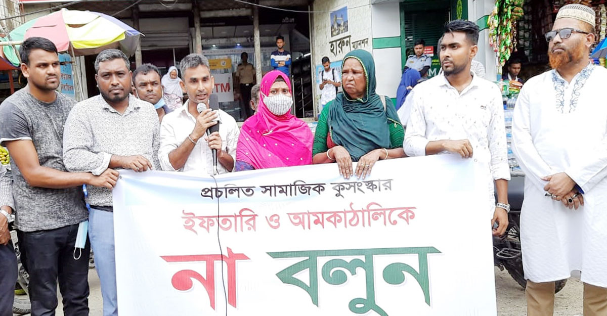 মানববন্ধনে বক্তারা বলেন, সম্প্রতি ইফতারিকে কেন্দ্র করে ওসমানীনগরে এক গৃহবধূ গলায় ফাঁস দিয়ে আত্মহত্যার ঘটনা ঘটেছে। এসব কুসংস্কারের কারণে অনেক বাবা নিঃস্ব হচ্ছে এবং অসংখ্য গৃহবধূ নির্যাতনের শিকার হচ্ছে। তাই এই কুসংস্কারের মারাত্মক ব্যাধি সমাজ থেকে দূর করতে সকলকে সচেষ্ট হতে হবে।