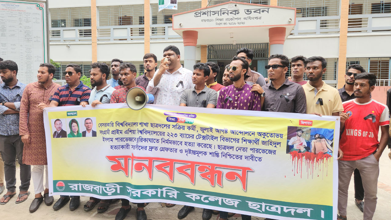 ছাত্রদল কর্মী ও প্রাইম এশিয়া বিশ্ববিদ্যালয়ের টেক্সটাইল ইঞ্জিনিয়ারিং বিভাগের শিক্ষার্থী জাহিদুল ইসলাম পারভেজকে হত্যার প্রতিবাদে রাজবাড়ী সরকারি কলেজে মানববন্ধন করেছে ছাত্রদল। সোমবার (২১ এপ্রিল) দুপুর ১২টার দিকে রাজবাড়ী সরকারি কলেজ ছাত্রদলের ব্যানারে কালো ব্যাজ ধারণ করে এই মানববন্ধন করা হয়।