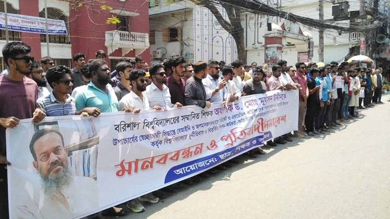 ববি অধ্যাপককে অব্যাহতির প্রতিবাদে বরিশালে মানববন্ধন