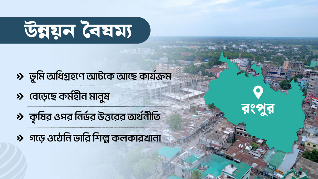 পিছিয়ে পড়া রংপুরের মানুষ বলছেন, বরাদ্দ বৈষম্যের শিকার হয়ে রংপুর বিভাগে শুধু দরিদ্র মানুষের সংখ্যাই বাড়েনি, বেড়েছে কর্মহীন মানুষও। দীর্ঘদিনেও হয়নি কাঙ্ক্ষিত শিল্পায়ন। ফলে কৃষির ওপর নির্ভর করে চলছে উত্তরাঞ্চলের জনগোষ্ঠীর অর্থনীতি। বিগত সরকার চারটি অর্থনৈতিক অঞ্চল প্রতিষ্ঠার অনুমোদন দিলেও আটকে আছে ভূমি অধিগ্রহণ কার্যক্রম। অথচ একই সময়ে ঢাকা ও চট্টগ্রামের অর্থনৈতিক অঞ্চলগুলোতে চলছে ব্যাপক কর্মযজ্ঞ।