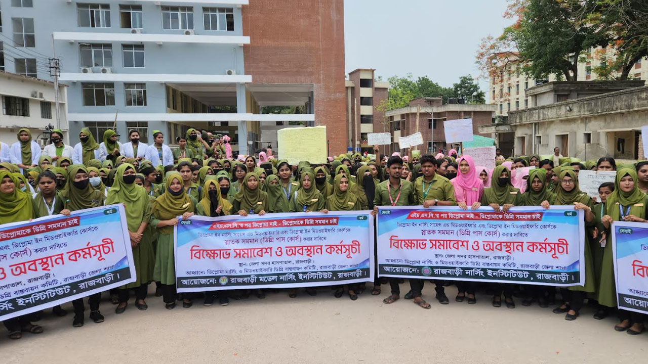 ডিপ্লোমা ইন নার্সিং সায়েন্স অ্যান্ড মিডওয়াইফারি এবং ডিপ্লোমা ইন মিডওয়াইফারি কোর্সকে স্নাতক সমমান (ডিগ্রি পাস কোর্স) করার দাবিতে ক্লাস, পরীক্ষা বর্জন করে রাজবাড়ীতে বিক্ষোভ সমাবেশ ও অবস্থান কর্মসূচি পালন করেছেন ডিপ্লোমা নার্সিংয়ে অধ্যায়নরত শিক্ষার্থীরা।