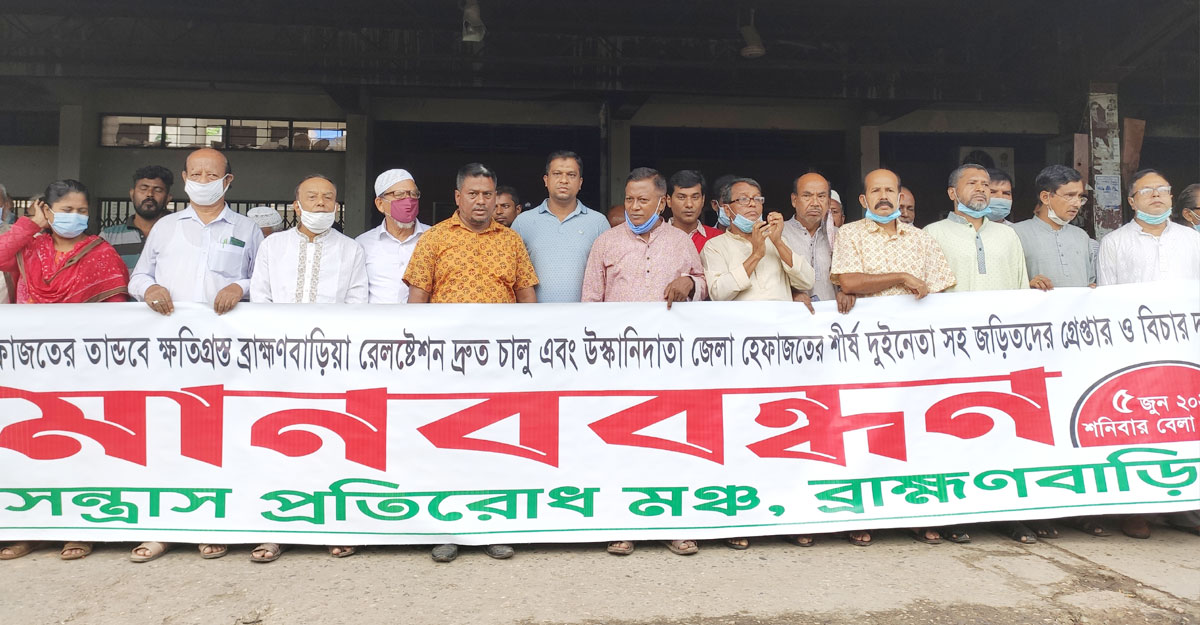 সন্ত্রাস প্রতিরোধ মঞ্চের আহ্বায়ক আব্দুন নূরের সভাপতিত্বে ও বাংলাদেশ আবৃত্তি সমন্বয় পরিষদের সাংগঠনিক সম্পাদক মো. মনির হোসেনের সঞ্চালনায় মানববন্ধনে বক্তব্য দেন ব্রাহ্মণবাড়িয়া প্রেস ক্লাবের সভাপতি রিয়াজ উদ্দিন জামি, সাধারণ সম্পাদক জাবেদ রহিম বিজন, জেলা ওয়ার্কার্স পার্টির সম্পাদক মণ্ডলির সদস্য নজরুল ইসলাম, ব্রাহ্মণবাড়িয়া সাংবাদিক ইউনিয়নের যুগ্ম আহ্বায়ক ফরহাদুল ইসলাম পারভেজ, আইনজীবী রাখেশ রায় প্রমুখ।
