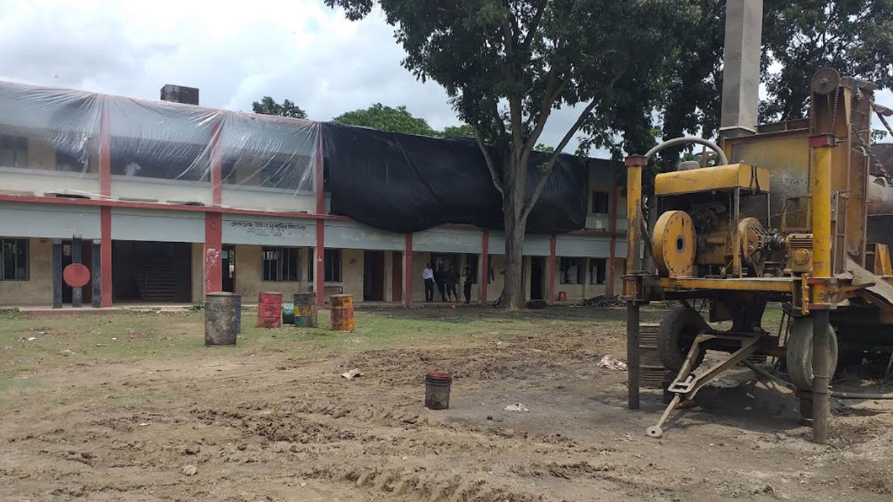 মাঠে চলছে বিটুমিন গলানোর কাজ, পলিথিন দিয়ে ঢাকা বিদ্যালয় ভবন