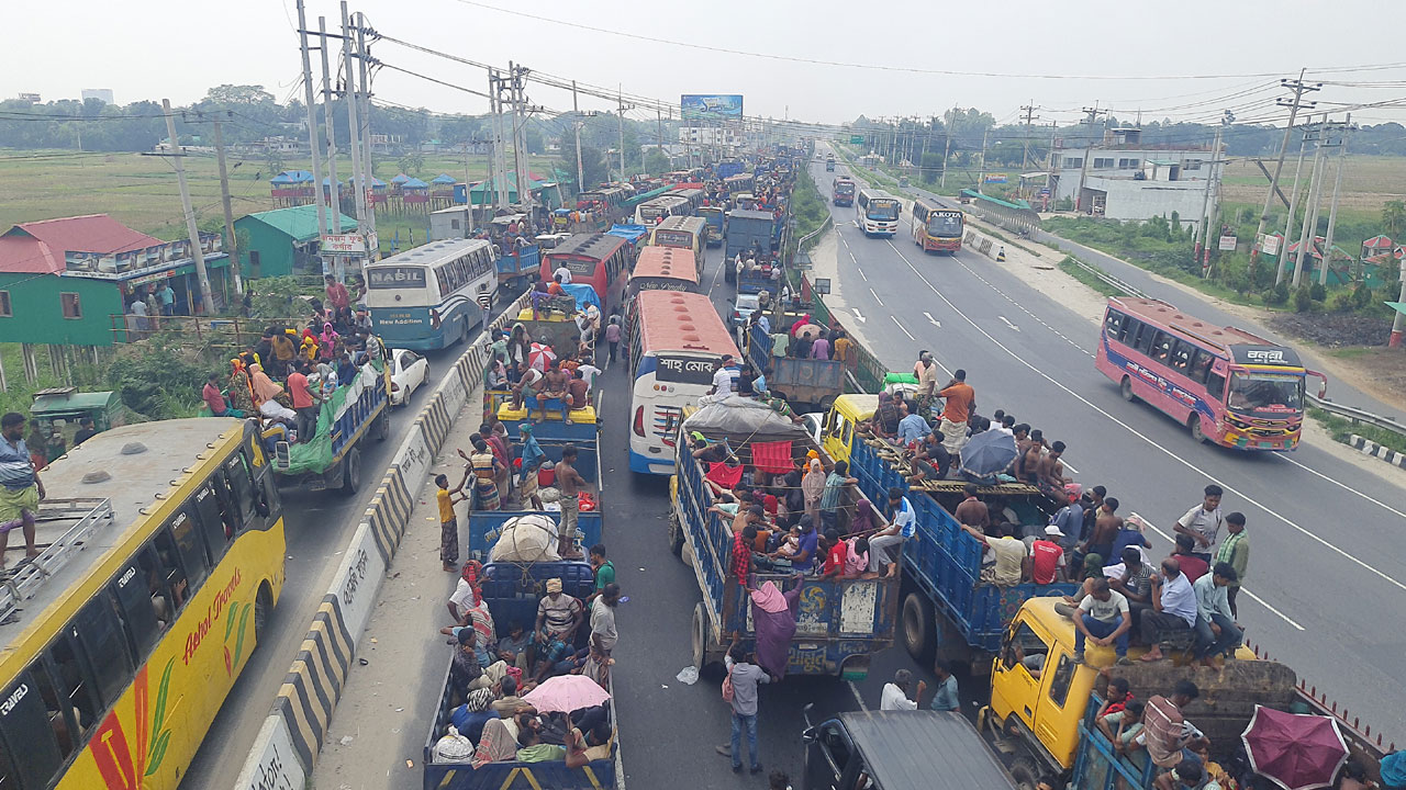 এলেঙ্গা বাস স্টেশন, রাবনা বাইপাস, আশেকপুর বাইপাস ঘুরে দেখা যায়, মহাসড়কে মানুষের ঢল নেমেছে। যাত্রীবাহী বাস ছাড়াও ট্রাক, পিকআপ, বিভিন্ন সড়কের লোকাল বাস, লেগুনায় যাত্রী পরিবহন করা হচ্ছে। মহাসড়কে বাসের চেয়ে ট্রাক ও পিকআপ বেশি দেখা যাচ্ছে। এ ছাড়া বাড়তি ভাড়া দিতে হচ্ছে যাত্রীদের। গণপরিবহন সংকট ও অতিরিক্ত ভাড়ার কারণে অনেকেই জীবনের ঝুঁকি নিয়ে খোলা ট্রাক-পিকআপ ও বাসের ছাদে গন্তব্যে যাচ্ছেন।