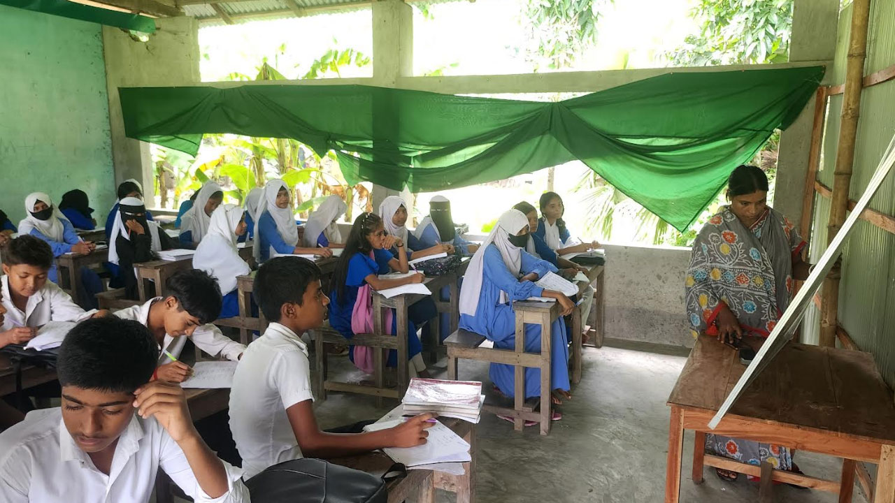 বৃষ্টি হলেই কাঁপে শিক্ষার্থীদের বুক, টিনশেড ঘরে পর্দা টানিয়ে চলে পাঠদান