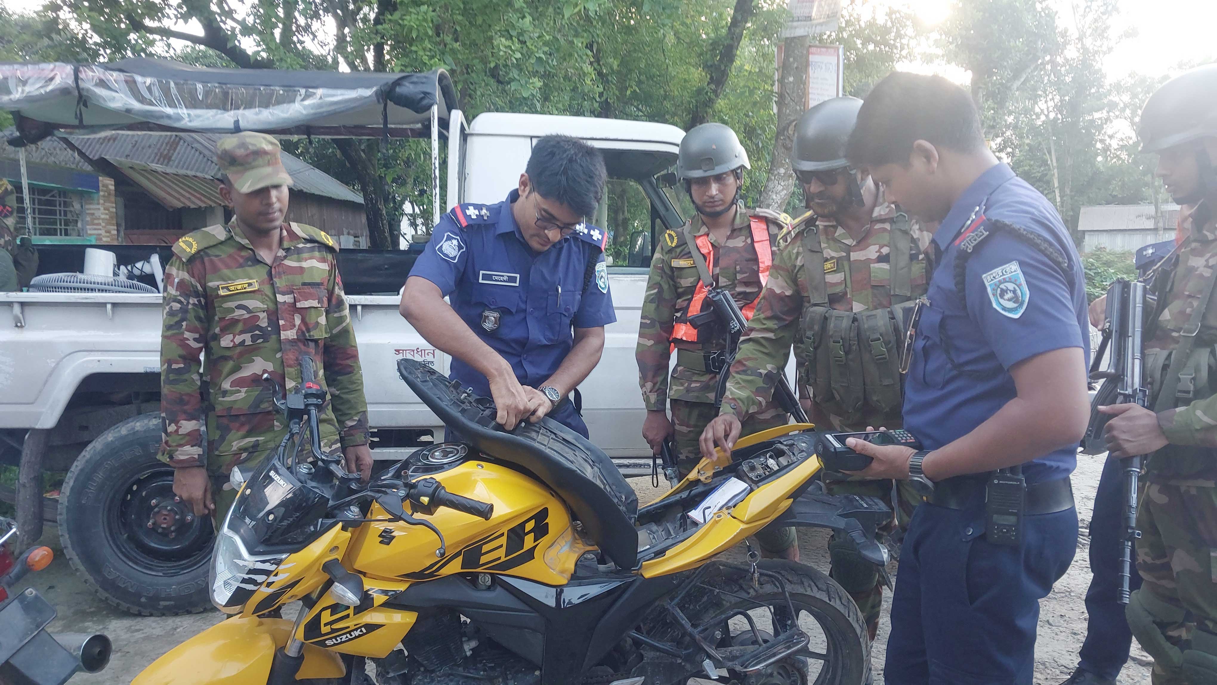 সেনাবাহিনী ও পুলিশ ঢাকা পোস্টকে জানা যায়, চলমান পরিস্থিতি মোকাবিলা ও অপরাধ নিয়ন্ত্রণে সেনাবাহিনীর সঙ্গে ট্রাফিক পুলিশ অভিযান চলমান রয়েছে। চেকপোস্টের অংশ হিসেবে আজ বিকেলে গড়েয়া রোডে বসা হয়। এসময় শহর থেকে কালিতলা বাজারের উদ্দেশ্যে বেপরোয়া গতিতে দুই যুবক মোটরসাইকেল নিয়ে যাচ্ছিলেন। সেনাবাহিনী ও পুলিশের সদস্যরা তাদের সিগন্যাল দিলে মোটরসাইকেল ফেলে ভৌঁ দৌড় দেন তারা। পরে মোটরসাইকেলটি জব্দ করে সেনা ও পুলিশের সদস্যরা তল্লাশি করলে গাড়ির সিটের ভেতরে মাদক দ্রব্যের কিছু উপকরণ পাওয়া যায়। পরে মোটরসাইকেলটি বিরুদ্ধে মামলা দেয় পুলিশ।