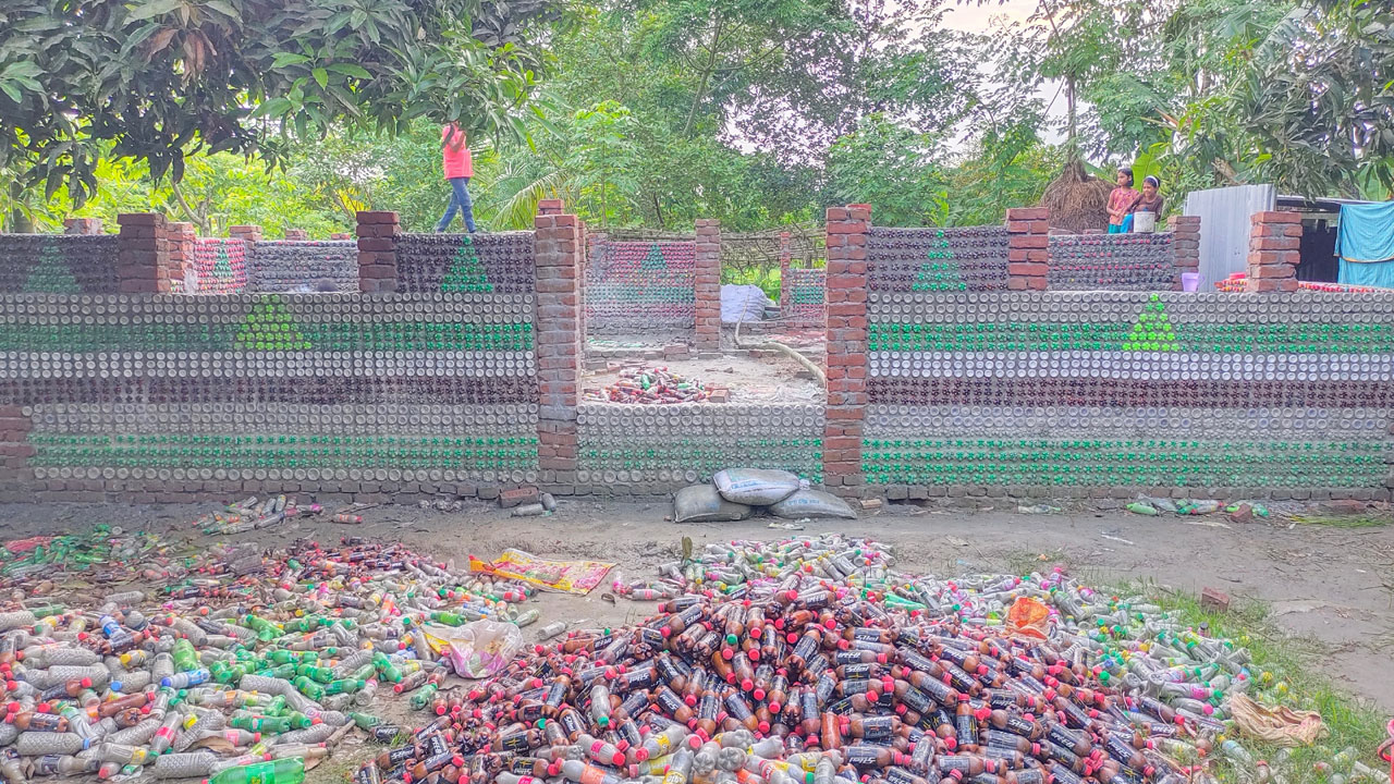 পরিত্যক্ত প্লাস্টিকের বোতলে বালু ভরে গাঁথুনি দিয়ে নির্মাণ করা হচ্ছে বাড়ির দেয়াল। ইটের পরিবর্তে সারি সারি প্লাস্টিকের বোতল দিয়ে সিমেন্ট দ্বারা গাঁথুনি তৈরি করায় বাড়িটি হয়ে উঠছে দৃষ্টিনন্দন। বাড়িটি দেখতে প্রতিদিনই স্থানীয়রা দূর-দূরান্ত থেকে আসছে মানুষ। অনেকে মনে করছেন, বাড়িটি পরিবেশবান্ধব হবে। একটি বাড়ি নির্মাণে হাজার হাজার বোতল ব্যবহৃত হওয়ায় পরিবেশ রক্ষা পাবে প্লাস্টিকের ক্ষতি থেকে।