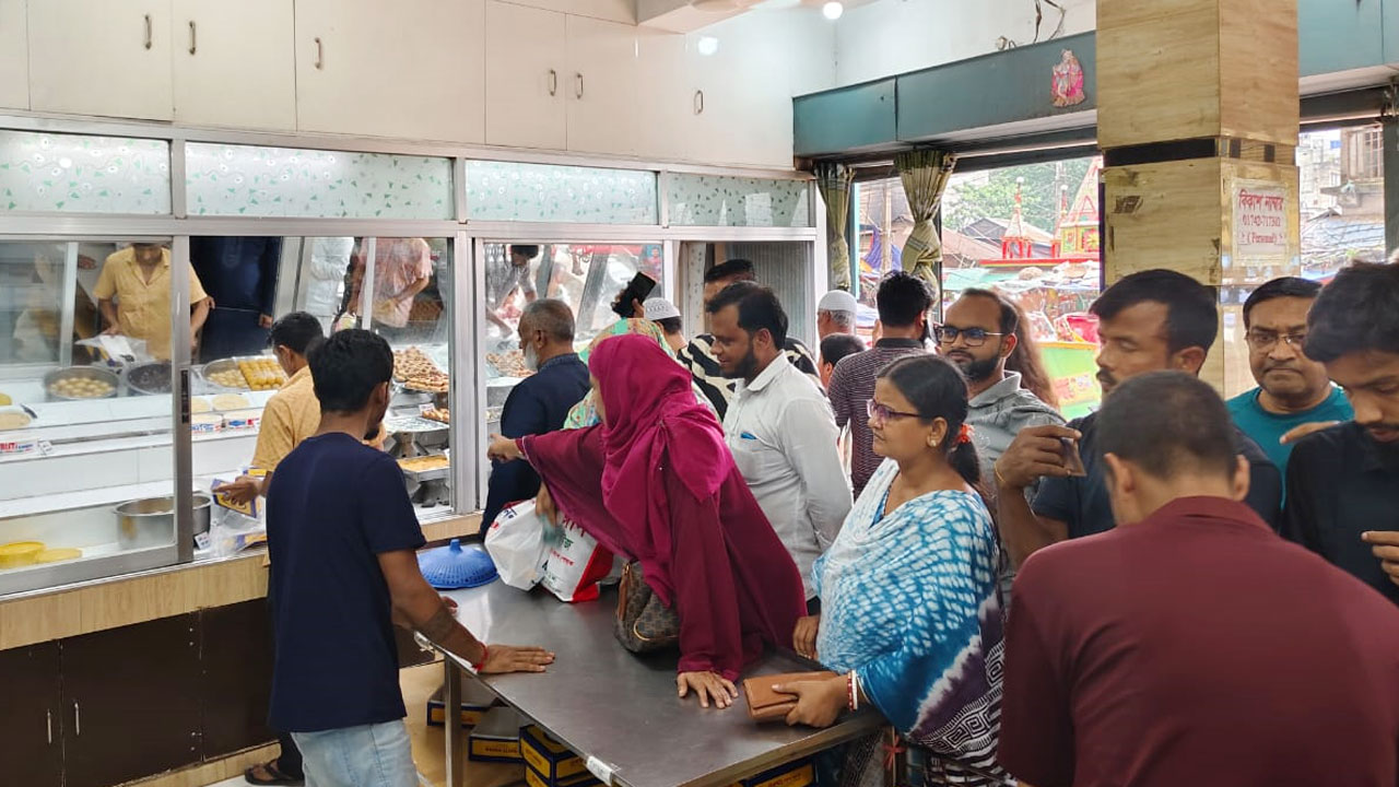 এ সময় নগরীর নতুন বাজার এলাকার মিষ্টি কাননে দেখা যায়- ক্রেতাদের চাহিদা অনুযায়ী পছন্দ মতো মিষ্টি দিতে গলদঘর্ম অবস্থা দোকান কর্মচারীদের। ফলে অনেকটা ভিড় সামলেই মিষ্টি কিনে বাড়ি ফিরছেন ক্রেতারা।
