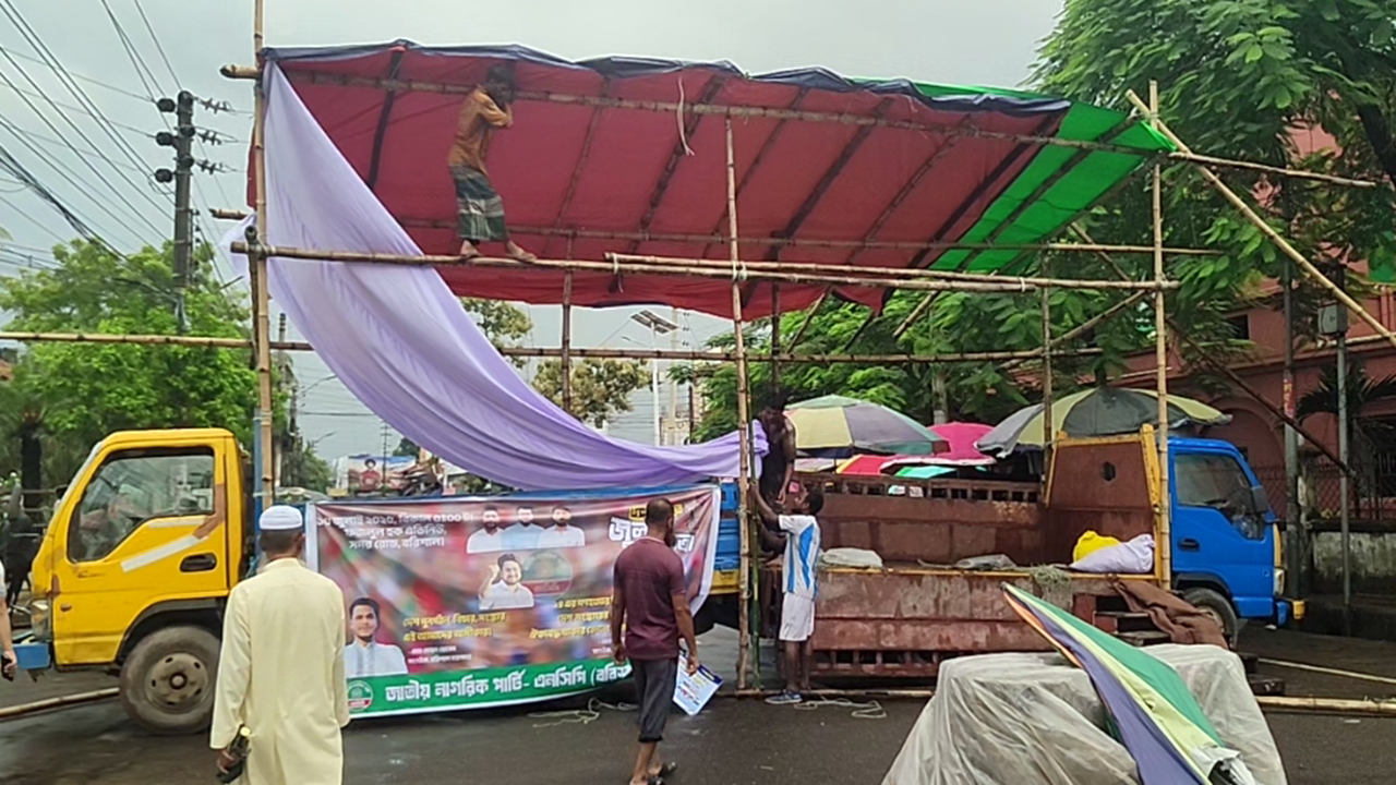 রাষ্ট্র সংস্কার, জুলাই গণহত্যার বিচার এবং বৈষম্যহীন বাংলাদেশ প্রতিষ্ঠার লক্ষ্যে জাতীয় নাগরিক পার্টির (এনসিপি) বরিশালের সভার শেষ সময়ের প্রস্তুতি চলছে। নগরীর ফজলুল হক এভিনিউ নগর ভবনের সামনে দুটি ট্রাক দিয়ে অস্থায়ী মঞ্চ প্রস্তুত করেছেন নেতৃবৃন্দ।