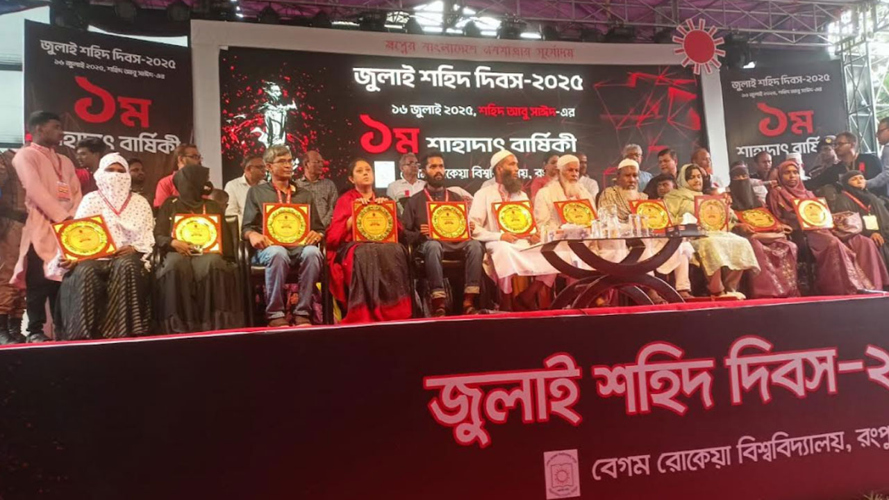 চব্বিশের ফ্যাসিবাদ বিরোধী গণআন্দোলনে পুলিশের গুলিতে নিহত শহীদ আবু সাঈদের প্রথম শাহাদাত বার্ষিকী এবং ‘জুলাই শহীদ দিবস’ উপলক্ষ্যে শহীদ পরিবারের প্রতি শ্রদ্ধা জানানোর নজির গড়েছে বেগম রোকেয়া বিশ্ববিদ্যালয় (বেরোবি) প্রশাসন। দিবসটি উপলক্ষ্যে আলোচনা সভার মঞ্চে আসন গ্রহণ করেছেন শহীদ পরিবারের সদস্যরা। মঞ্চের সামনে দর্শক সারিতে বসেছেন দুই উপদেষ্টাসহ সম্মানিত অতিথিরা। শুধু তাই নয়, শহীদ আবু সাঈদের বাবা মকবুল হোসেনকে করা হয়েছে এ অনুষ্ঠানের প্রধান অতিথি।