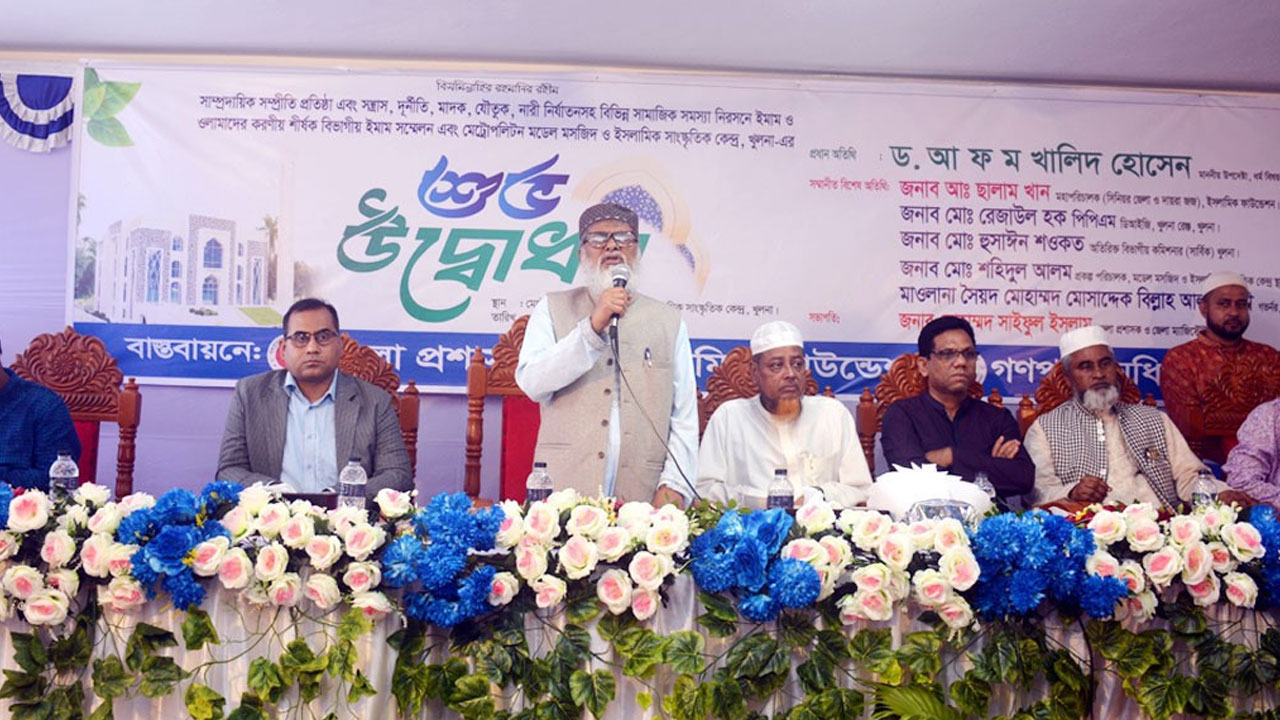 শুক্রবার (জুলাই ১৮) দুপুরে খুলনা মেট্রোপলিটন মডেল মসজিদ ও ইসলামিক সাংস্কৃতিক কেন্দ্রের উদ্বোধন এবং ‘সাম্প্রদায়িক সম্প্রীতি প্রতিষ্ঠা এবং সন্ত্রাস, দুর্নীতি, মাদক, যৌতুক, নারী নির্যাতনসহ সামাজিক সমস্যা নিরসনে ইমাম-ওলামাদের করণীয়’ শীর্ষক বিভাগীয় ইমাম সম্মেলনে প্রধান অতিথির বক্তব্যে তিনি এসব কথা বলেন।