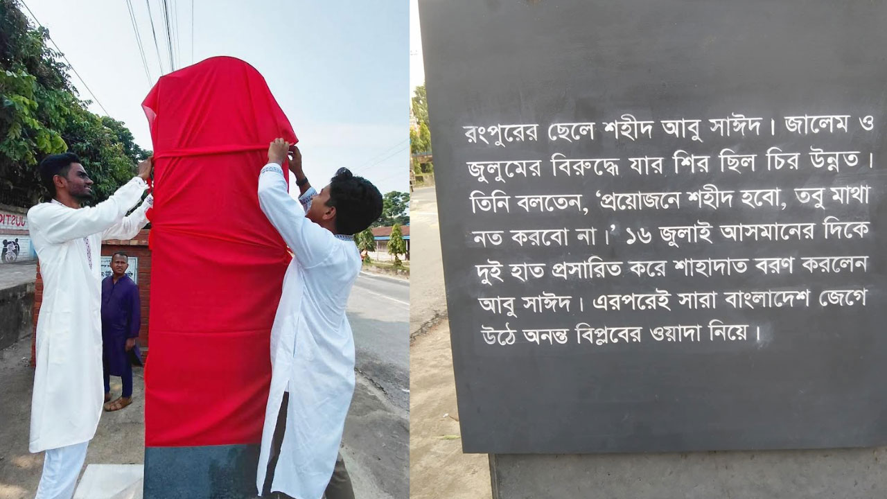 শুক্রবার (১৮ জুলাই) দুপুরে বিশ্ববিদ্যালয়ের প্রধান ফটক সংলগ্ন শহীদ আবু সাঈদ গেটের পাশে স্থাপিত ওই ‘শহীদ আবু সাঈদ স্ট্রিট মেমোরি স্ট্যাম্প’-কাপড়ে ঢেকে দেওয়া হয়। এ সময় শহীদ আবু সাঈদের ভাই আবু হোসেন, জুলাই আন্দোলনে যুক্ত শিক্ষার্থী শামসুর রহমান সুমন, আরমান হোসেন, মাহিদ হাসান শাকিল, তুহিন রানা, রিফাত রাফিসহ আরও অনেকে উপস্থিত ছিলেন।