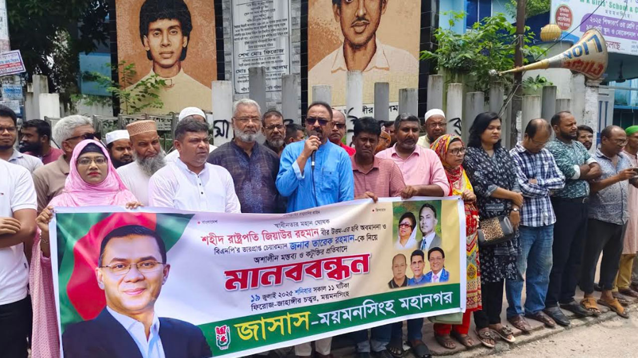 শনিবার (১৯ জুলাই) দুপুর ১২টায় ময়মনসিংহ নগরীর ফিরোজ-জাহাঙ্গীর চত্বরে শহীদ প্রেসিডেন্ট জিয়াউর রহমানের ছবি অপমান এবং তারেক রহমানকে নিয়ে কটুক্তির প্রতিবাদে মহানগর জাসাস আয়োজিত মানববন্ধনে বিএনপি নেতারা এই হুঁশিয়ারি উচ্চারণ করেন। এতে প্রধান অতিথির বক্তব্য রাখেন বিএনপির নির্বাহী কমিটির সহসাংগঠনিক সম্পাদক আবু ওয়াহাব আকন্দ ওয়াহিদ।