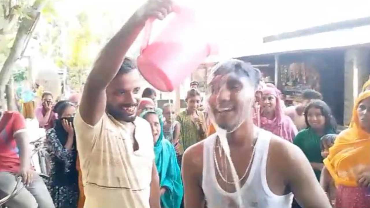 এরপরই তালাকের ‘আনন্দে’ পরদিন স্থানীয় বাজারে ২৫ কেজি দুধ এনে গোসল করেন হৃদয় মিয়া। আয়োজন চলে গ্রামীণ গানের তালে তালে। গোসলের সময় তার পাশে ছিলেন স্বজন ও প্রতিবেশীরাও।