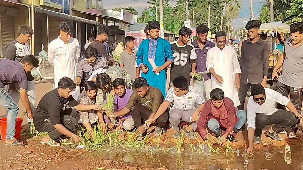 গায়েবানা জানাজার পর এবার সেই সড়কে ধানের চারা রোপণ