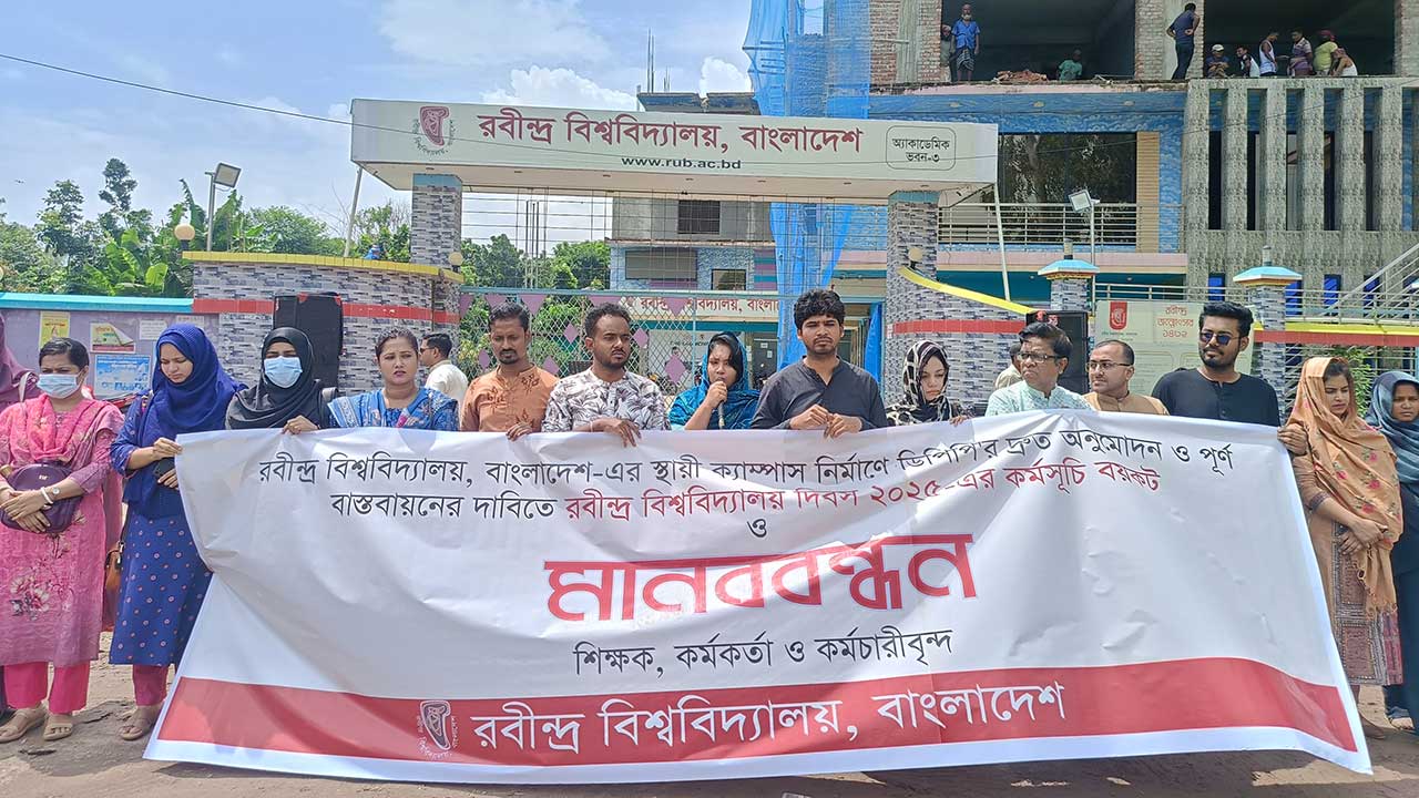 স্থায়ী ক্যাম্পাস নির্মাণে ডিপিপি দ্রুত অনুমোদন ও বাস্তবায়নের দাবিতে ২০২৫ সালের রবীন্দ্র বিশ্ববিদ্যালয় দিবসের কর্মসূচি বয়কট করে কালো ব্যাজ ধারণ ও মানববন্ধন করেছেন বিশ্ববিদ্যালয়ের শিক্ষক, শিক্ষার্থী ও কর্মচারীরা।