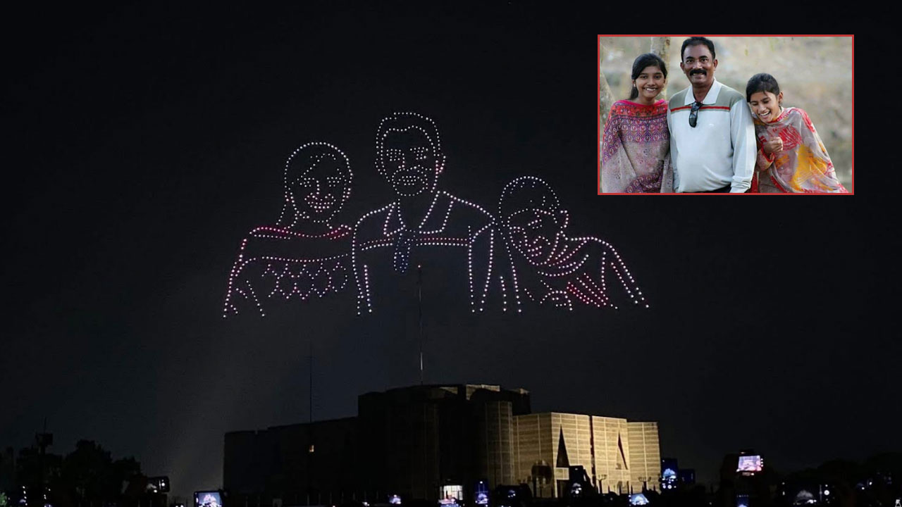 পতিত সরকারের আমলে নির্মম ও বিচার বহির্ভূত হিসেবে আলোচিত হত্যাকাণ্ডের শিকার একরাম ও তার দুই কন্যার হাস্যোজ্জ্বল একটি চিত্র ফুটিয়ে তোলা হয়েছে ‘৩৬ জুলাই উদযাপন’- এর ড্রোন প্রদর্শনীতে।