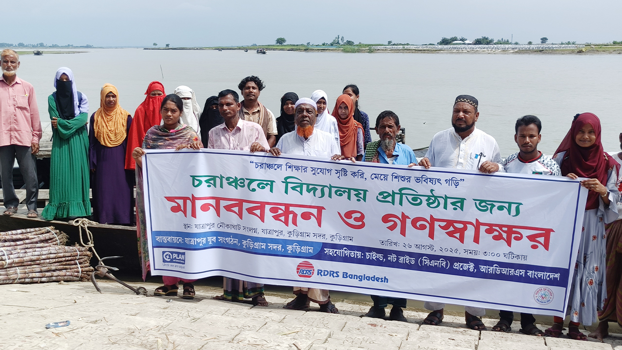 “চরাঞ্চলে শিক্ষার সুযোগ সৃষ্টি করি, মেয়ে শিশুর ভবিষ্যৎ গড়ি” এই স্লোগানে কুড়িগ্রামের চরাঞ্চলে বিদ্যালয় প্রতিষ্ঠার দাবিতে মানববন্ধন ও গণস্বাক্ষর কর্মসূচি পালন করেছে যাত্রাপুর যুব সংগঠন।