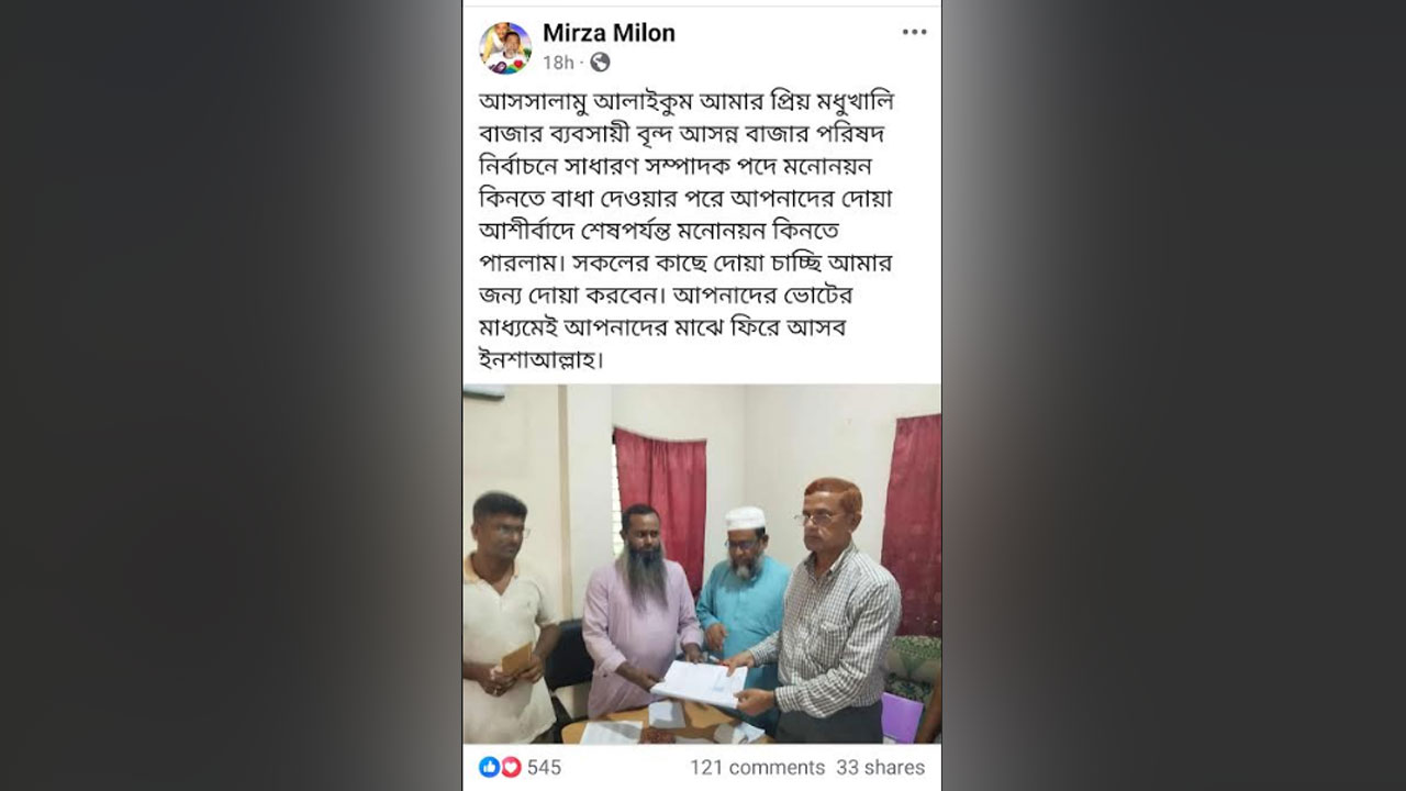 মনোনয়নপত্র সংগ্রহ করার ছবিটাও মির্জা মিলনের ফেসবুক আইডিতে গতকাল বৃহস্পতিবার বিকেল সাড়ে ৫টায় আপলোড করা হয়। ওই পোস্টে বলা হয়, ‘আসসালামু আলাইকুম, আমার প্রিয় মধুখালী বাজার ব্যবসায়ীবৃন্দ। আসন্ন বাজার পরিষদ নির্বাচনে সাধারণ সম্পাদক পদে মনোনয়ন কিনতে বাধা দেওয়ার পরে আপনাদের দোয়া-আশীর্বাদে শেষপর্যন্ত মনোনয়ন কিনতে পেরেছি। সকলের কাছে দোয়া চাচ্ছি, আমার জন্য দোয়া করবেন। আপনাদের ভোটের মাধ্যমেই আপনাদের মাঝে ফিরে আসব, ইনশাআল্লাহ।’
