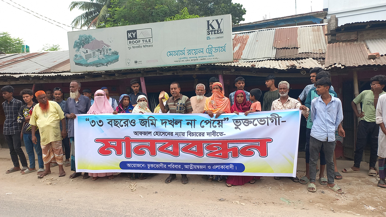 ৩৩ বছর আগে কিনেছেন জমি। জমির দখল বুঝে পাননি আজও। স্থানীয় এক প্রভাবশালী ব্যক্তি সেই জমি দখল করে সেখানে নির্মাণ করেছেন দোকানঘর। ঘটনার ভুক্তোভোগীর নাম আফজাল হোসেন। দীর্ঘদিন আইনি লড়াই চালিয়েও জমির দখল না পেয়ে অবশেষে ন্যায় বিচারের দাবিতে মানববন্ধন করেছেন আফজাল হোসেন, তার পরিবার ও আত্মীয়-স্বজনেরা।